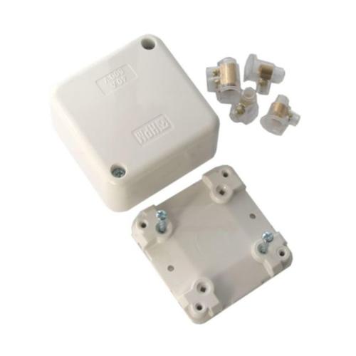 HPM Standard-Size Junction Box: Designed for easy wiring and fast installation, this junction box is an essential tool for electricians. Perfect for both residential and commercial applications, it features a robust design with 4 connectors, each rated at 40A. The package includes 3 x 1-screw terminals, 1 x 2-screw terminal, a white cover, and a white base. It also comes with 2 twisted nail screws for securing the cover and 2 additional screws for installation